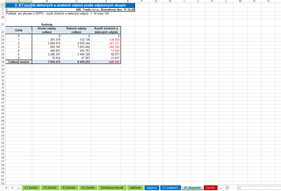 Součty daňových a účetních odpisů podle odpisových skupin – podklad pro přiznání k DPPO - rozdíl účetních a daňových odpisů - ř. 50 nebo 150