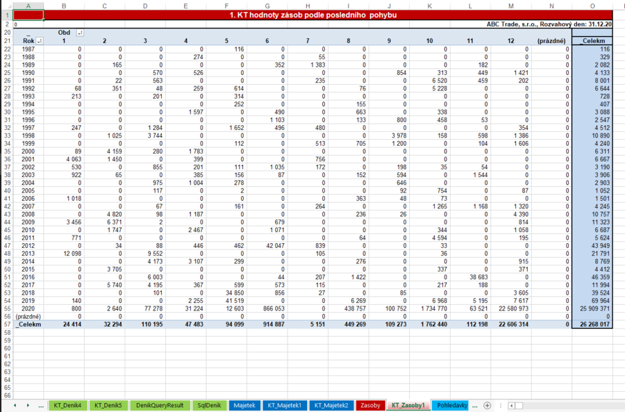 Analýza bezobrátkových zásob - ukázka kontingenční tabulky hodnot zásob podle posledního data pohybu.